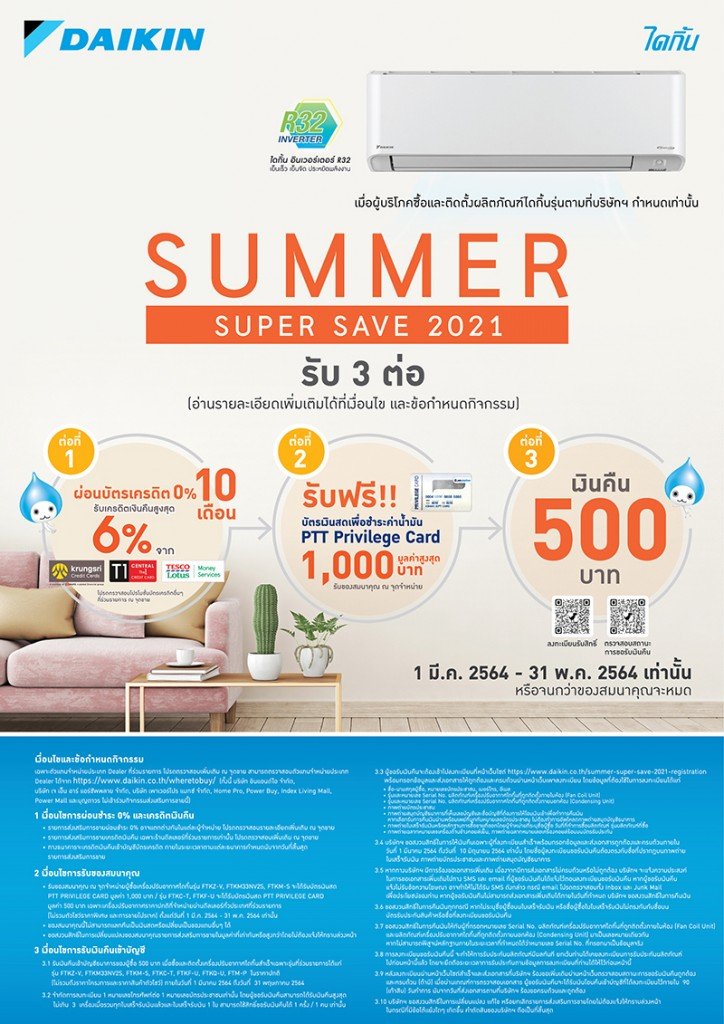 กลับมาอีกครั้งกับโปรโมชั่นต้อนรับหน้าร้อนกับ Daikin Summer Super Save 2021 รอบนี้มาพร้อมกับโปรโมชั่นสุดพิเศษถึง 3 ต่อ ต่อที่ 1 เมื่อซื้อเครื่องปรับอากาศไดกิ้นรุ่นที่ร่วมรายการ รับสิทธ์ผ่อน 0% 10 เดือน และรับเครดิตเงินคืนสูงสุดถึง 6% กับ Krungsri Credit Card ต่อที่ 2 รับไปเลยทันที บัตรเงินสดเพื่อชำระค่าน้ำมัน PTT Privilege Card มูลค่าสูงสุดถึง 1,000 บาท และพิเศษสุดกับต่อที่ 3 รับเงินคืน 500 บาท เมื่อซื้อและติดตั้งเครื่องปรับอากาศสำเร็จ โปรโมชั่นทั้ง 3 ต่อ เริ่มตั้งแต่วันที่ 1 มีนาคม 2564 - 31 พฤษภาคม 2564 หรือจนกว่าของสมนาคุณจะหมด โปรโมชั่นจัดหนักแบบนี้ พบได้ที่ ร้านค้าตัวแทนจำหน่ายดีลเลอร์ที่ร่วมรายการเท่านั้น (Home Pro, Power Buy, Index Living Mall, Power Mall, บุญถาวร, บริษัท อินแอนด์ไอ จำกัด, บริษัท เพาเวอร์โปร แมกซ์ จำกัด และ บริษัท เจ เอ็น อาร์ แอร์ซัพพลาย จำกัด ไม่เข้าร่วมกิจกรรมส่งเสริมการขายนี้)