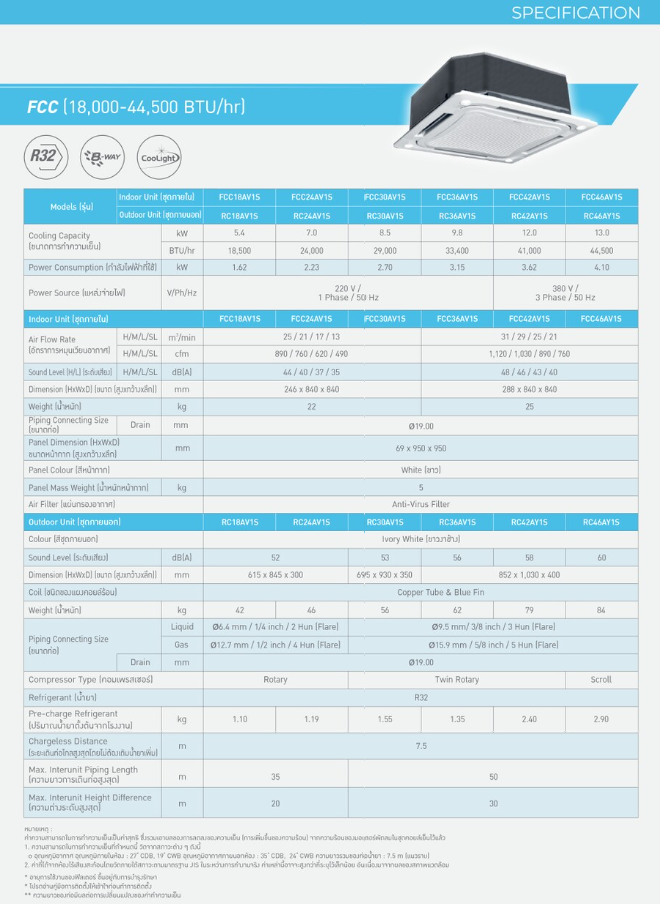 Non Inverter 8-Way Cassette FCC-AV1S เครื่องปรับอากาศแบบฝังในฝ้ากระจายลมแปดทิศทาง (8-Way Cassette) ระบบ Non-inverter สารทำความเย็นชนิด R32 เป็นมิตรต่อสิ่งแวดล้อม เย็นเร็วทั่วถึง ติดตั้งและดูแลรักษาง่าย มีปั๊มน้ำทิ้งเป็นอุปกรณ์มาตรฐาน ปั๊มน้ำได้สูงสุด 70 ซม. พร้อมเทคโนโลยีใหม่ล่าสุดกับหน้ากากหลอดไฟ LED สี่มุม (อุปกรณ์เสริม) ซึ่งสามารถควบคุมการเปิด-ปิดไฟอิสระโดยไม่ต้องเปิดแอร์