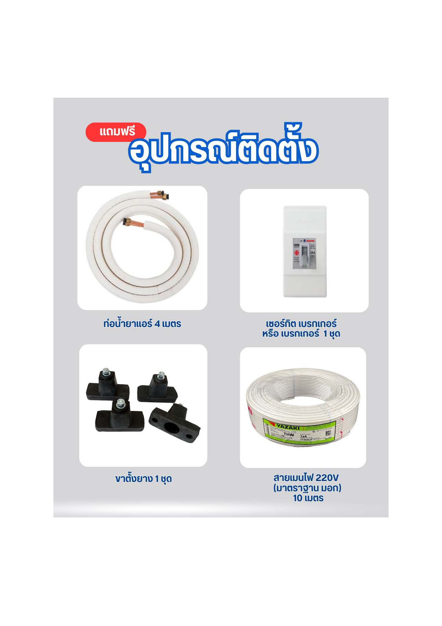 - ฟรี สายไฟ 10 เมตร ส่วนเกิน 80 บาท/เมตร พร้อมเบรกเกอร์ 1 ชุด สำหรับระบบไฟ 220v