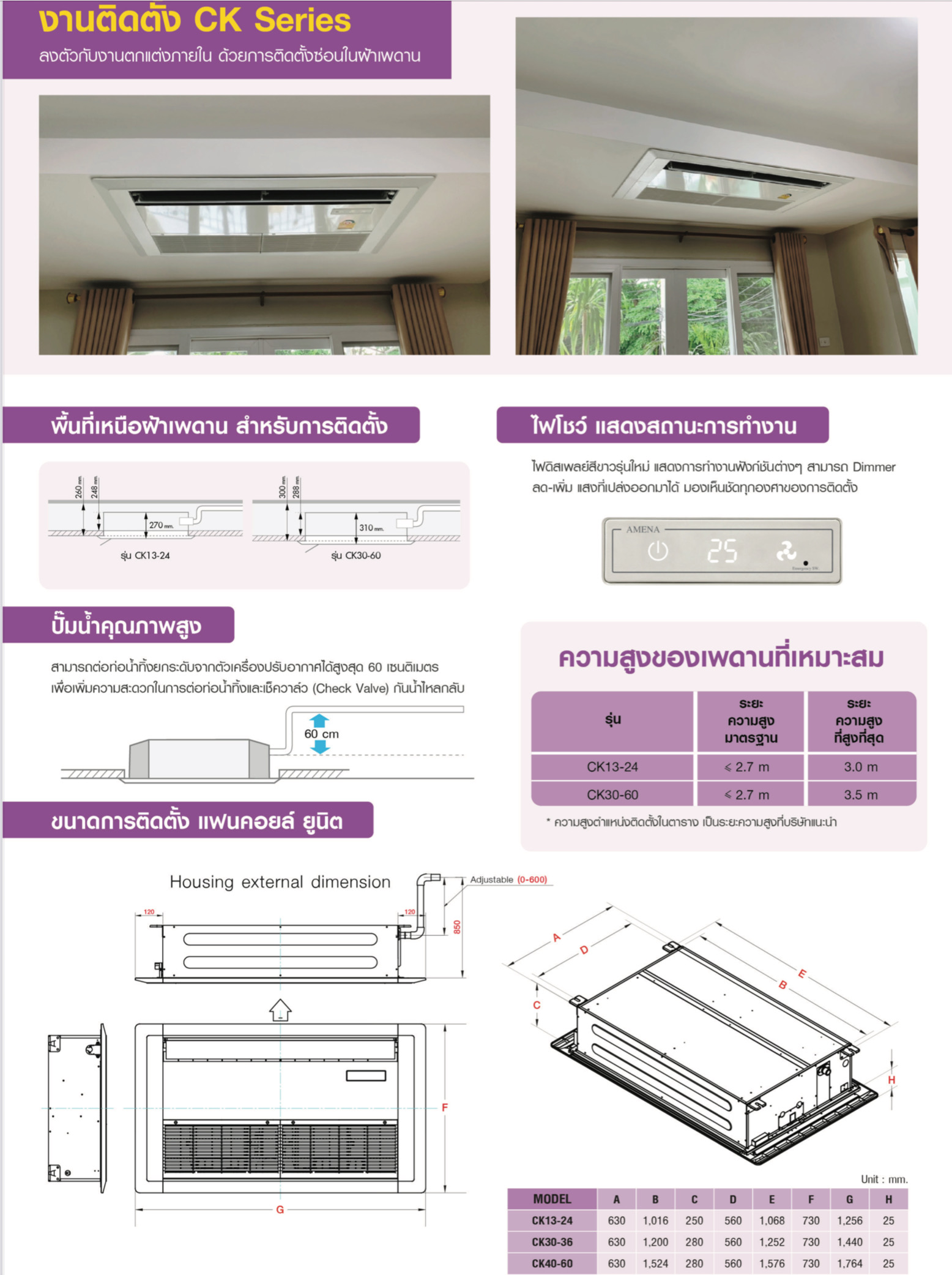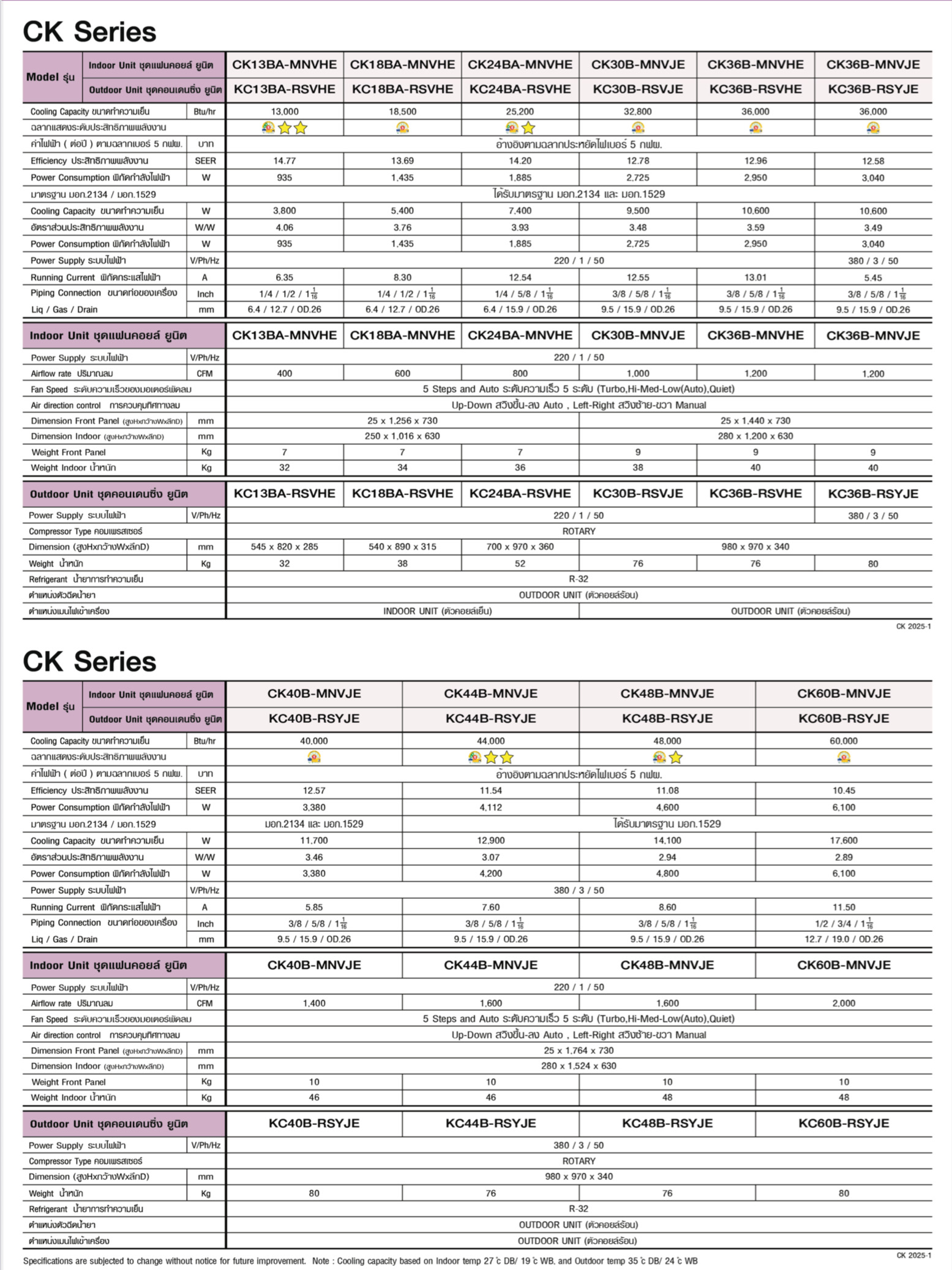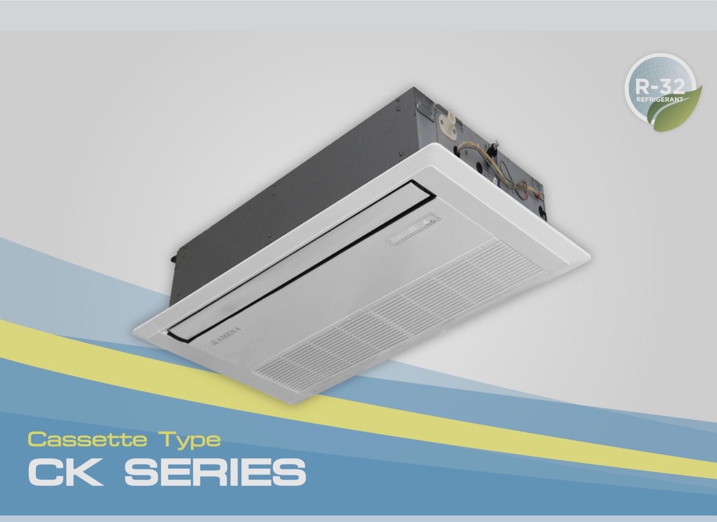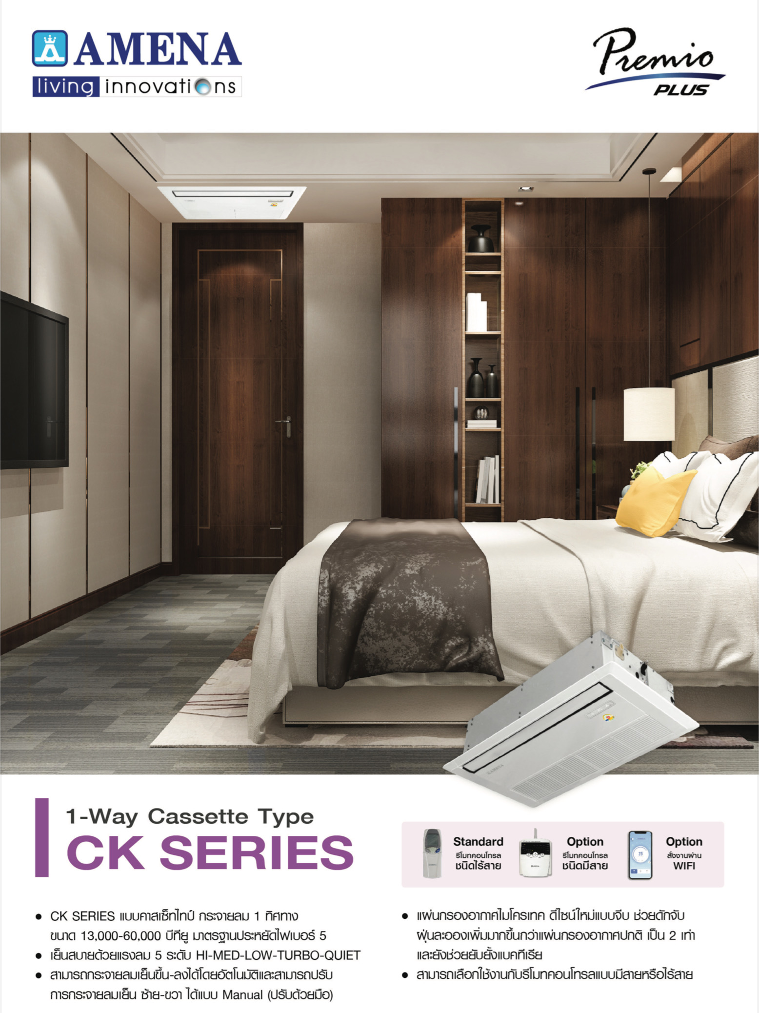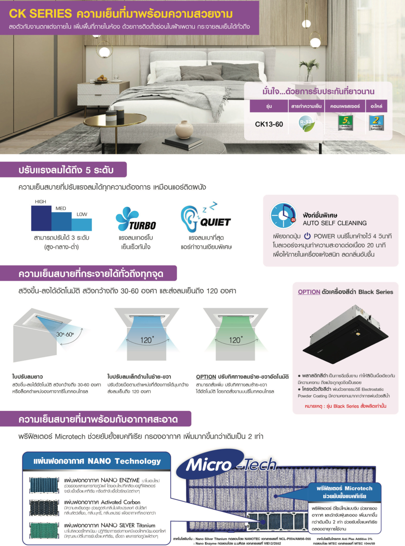 CK SERIES แบบคาสเซ็ท ไทป์ กระจายลม 1 ทิศทาง เย็นสบายด้วยแรงลม 5 ระดับ HI-MED-LOW-TURBO-QUIET สามารถกระจายลมเย็นขึ้น-ลงได้โดยอัตโนมัติและสามารถปรับ การกระจายลมเย็น ซ้าย-ขวา ได้แบบ Manual (ปรับด้วยมือ) แผ่นกรองอากาศไมโครเทค ดีไซน์ใหม่แบบจีบ ช่วยดักจับ ฝุ่นละอองเพิ่มมากขึ้นกว่าแผ่นกรองอากาศปกติ เป็น 2 เท่า และยังช่วยยับยั้งแบคทีเรีย ขนาด 13,000-60,000 บีทียู มาตรฐานประหยัดไฟเบอร์ 5