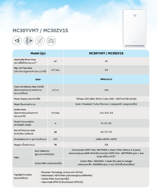 เครื่องฟอกอากาศไดกิ้น ฟอกอากาศภายในเครื่องด้วย Streamer ยับยั้งเชื้อไวรัส แบคทีเรีย สารก่อภูมิแพ้ และกลิ่น พร้อมฟิลเตอร์ HEPA แบบไฟฟ้าสถิต ยับยั้งฝุ่นขนาดเล็ก ครอบคลุมพื้นที่ 23 ตารางเมตร