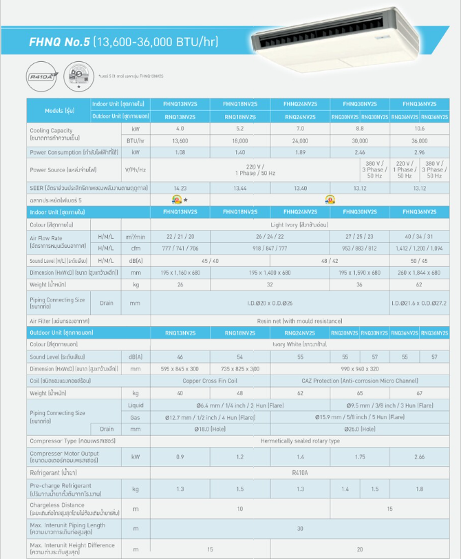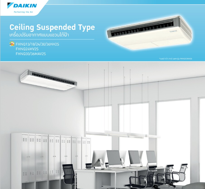 Non Inverter Ceiling FHNQ-NV2S แบบแขวนใต้ฝ้า (Ceiling) FHNQ-NV2S ประหยัดไฟเบอร์ 5 ใช้สารทำความเย็น R410A ให้ประสิทธิภาพการทำความเย็นสูงและไม่ทำลายชั้นบรรยากาศ กำลังลมแรง แขวนใต้ฝ้าได้สูงสุดถึง 3.5 เมตร ติดตั้งง่ายบางสุดเพียง 195 มม. ติดตั้งได้แม้ในพื้นที่แคบ ทนทานด้วยแผงระบายความร้อนที่ชุดคอยล์ร้อนเคลือบสารป้องกันการกัดกร่อน ใช้งานได้ยาวนาน
